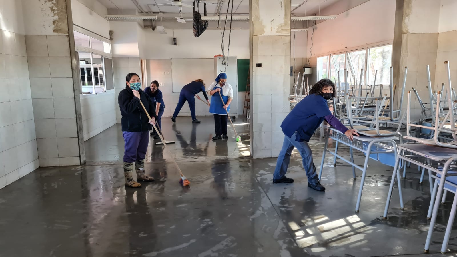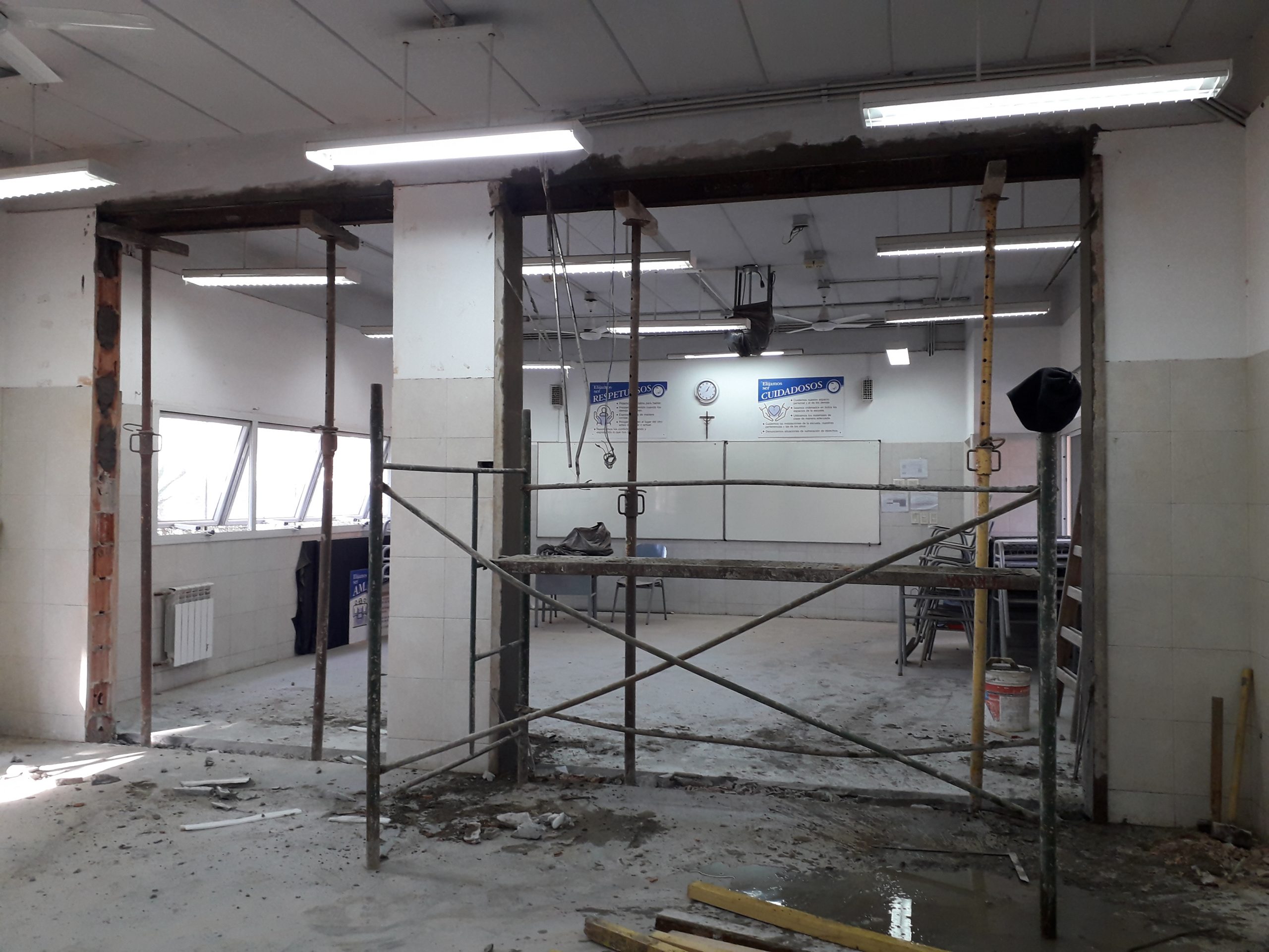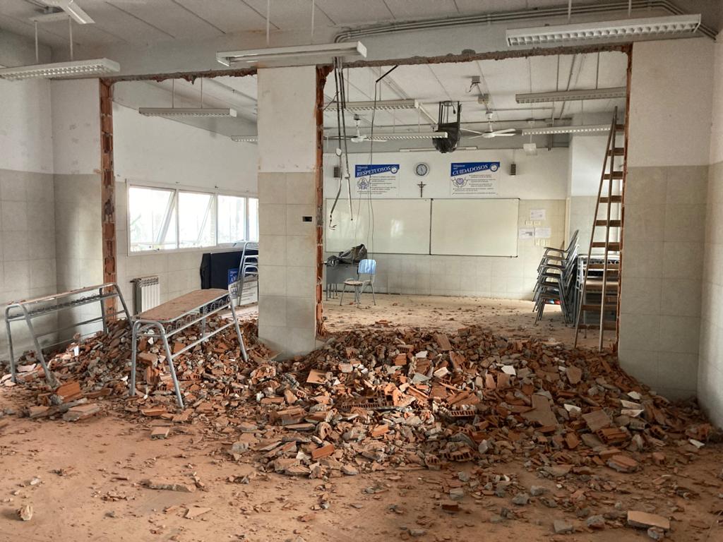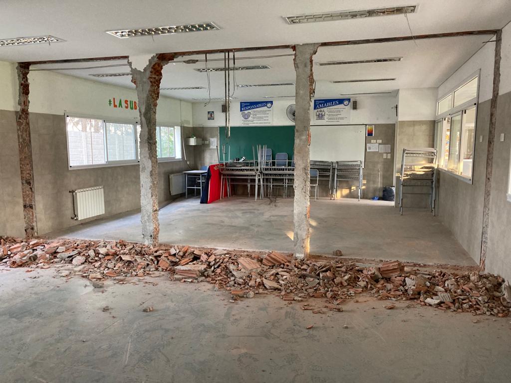 Para ello, se derribaron los muros linderos de dos pares de aulas, quedando dos nuevas aulas de 98 m2 cada una para albergar a la totalidad de los alumnos en línea con los protocolos vigentes.