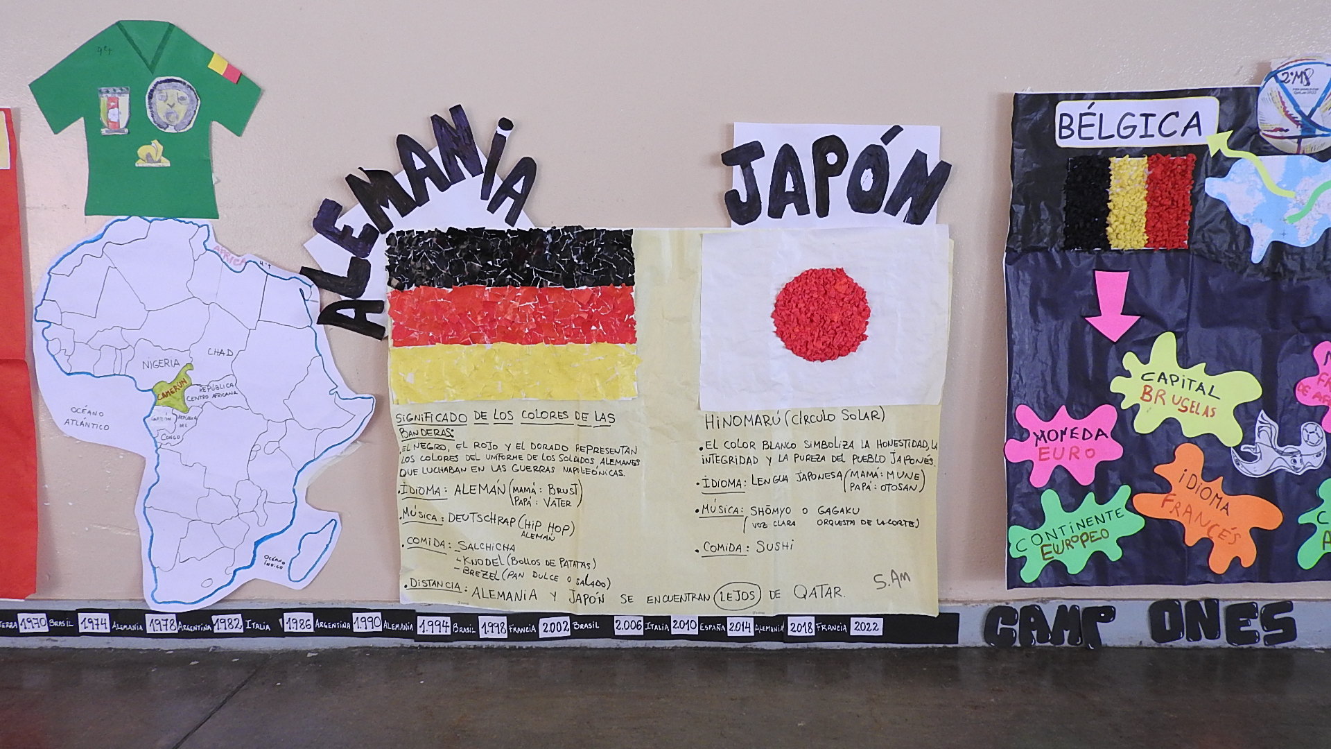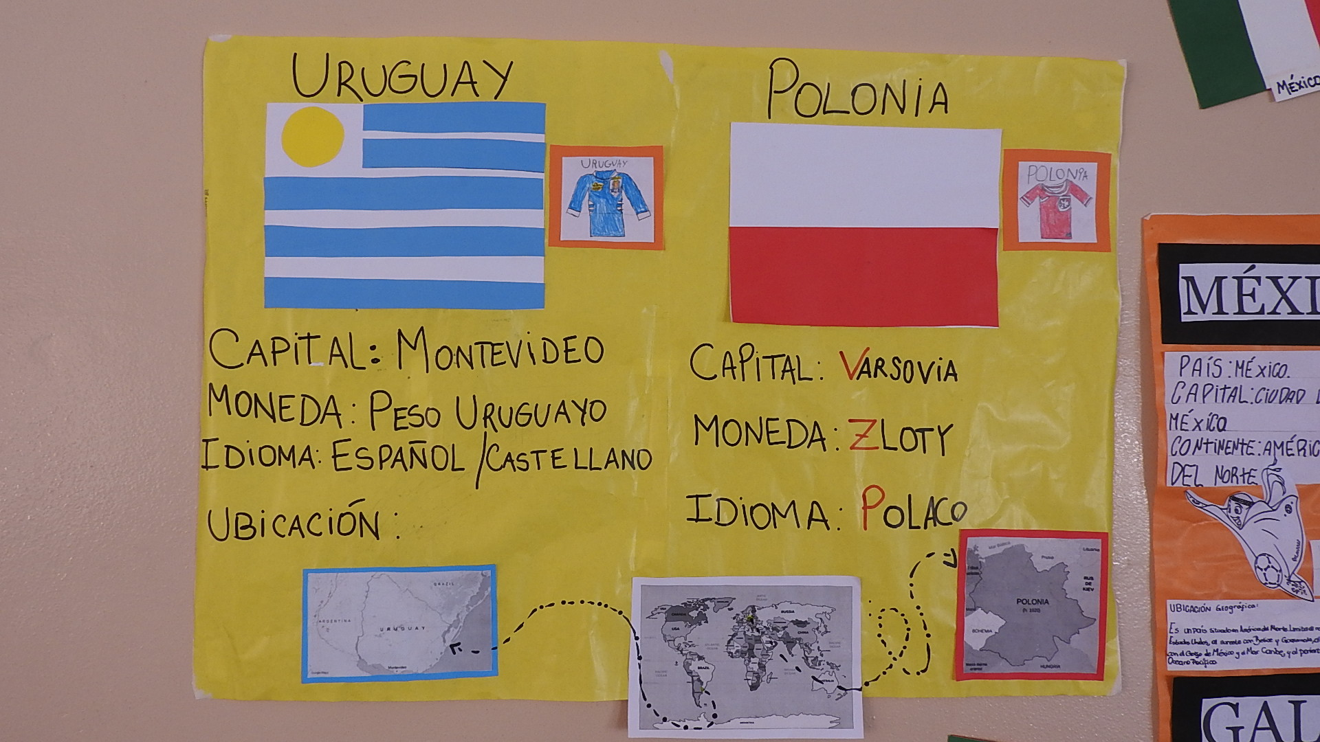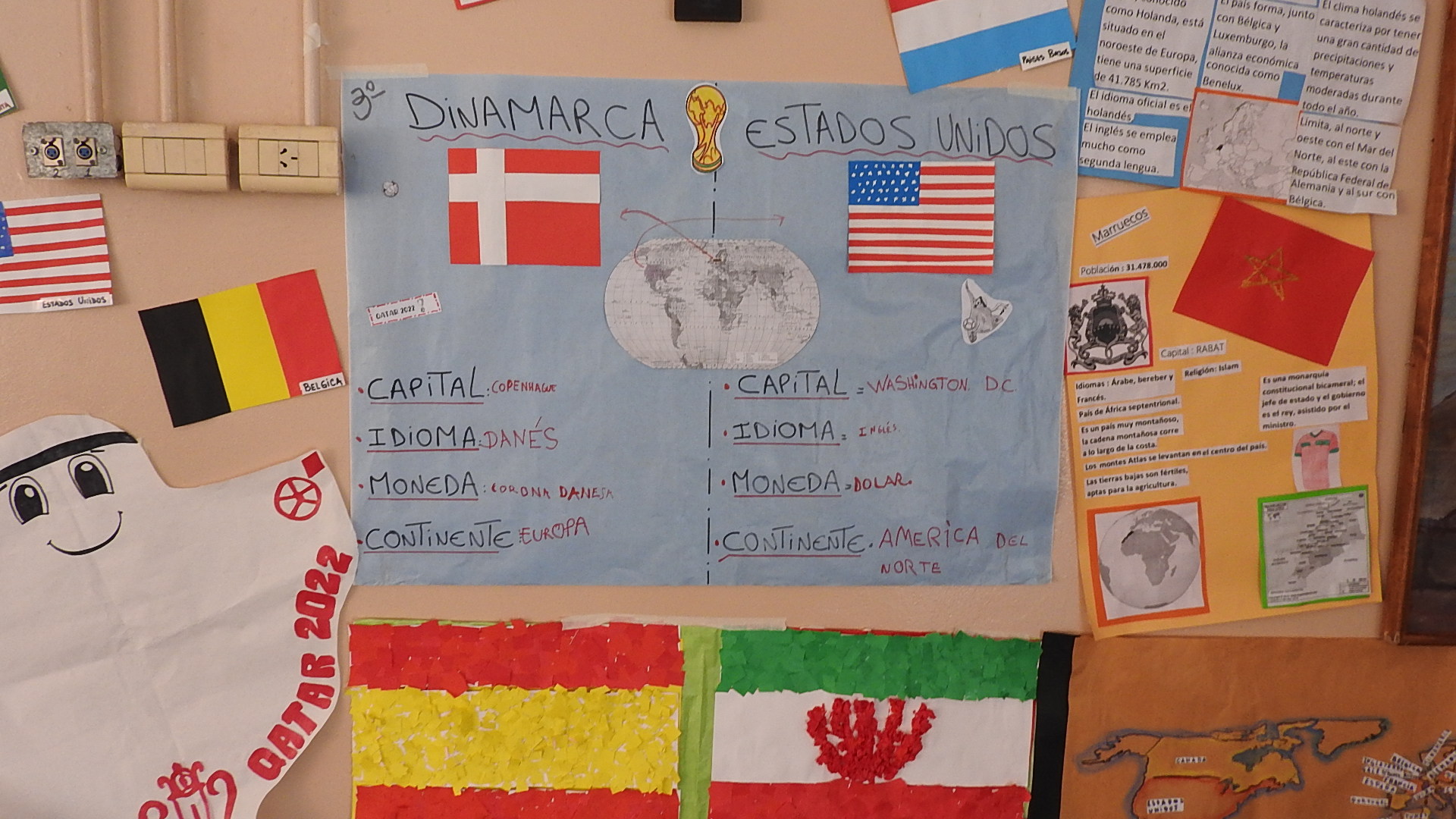 Completar un álbum nos ayudó a aprender sobre los países. Hicimos un sorteo del Mundial CMT en el que cada grado sacó dos países acerca de los cuales investigar. Luego, los trabajos de todos fueron expuestos en el SUM conformando un mural.